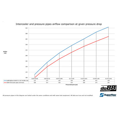 This diagram shows the charge air flow at different pressure drops of do88 BigPack compared to OEM intercooler and pipes*: