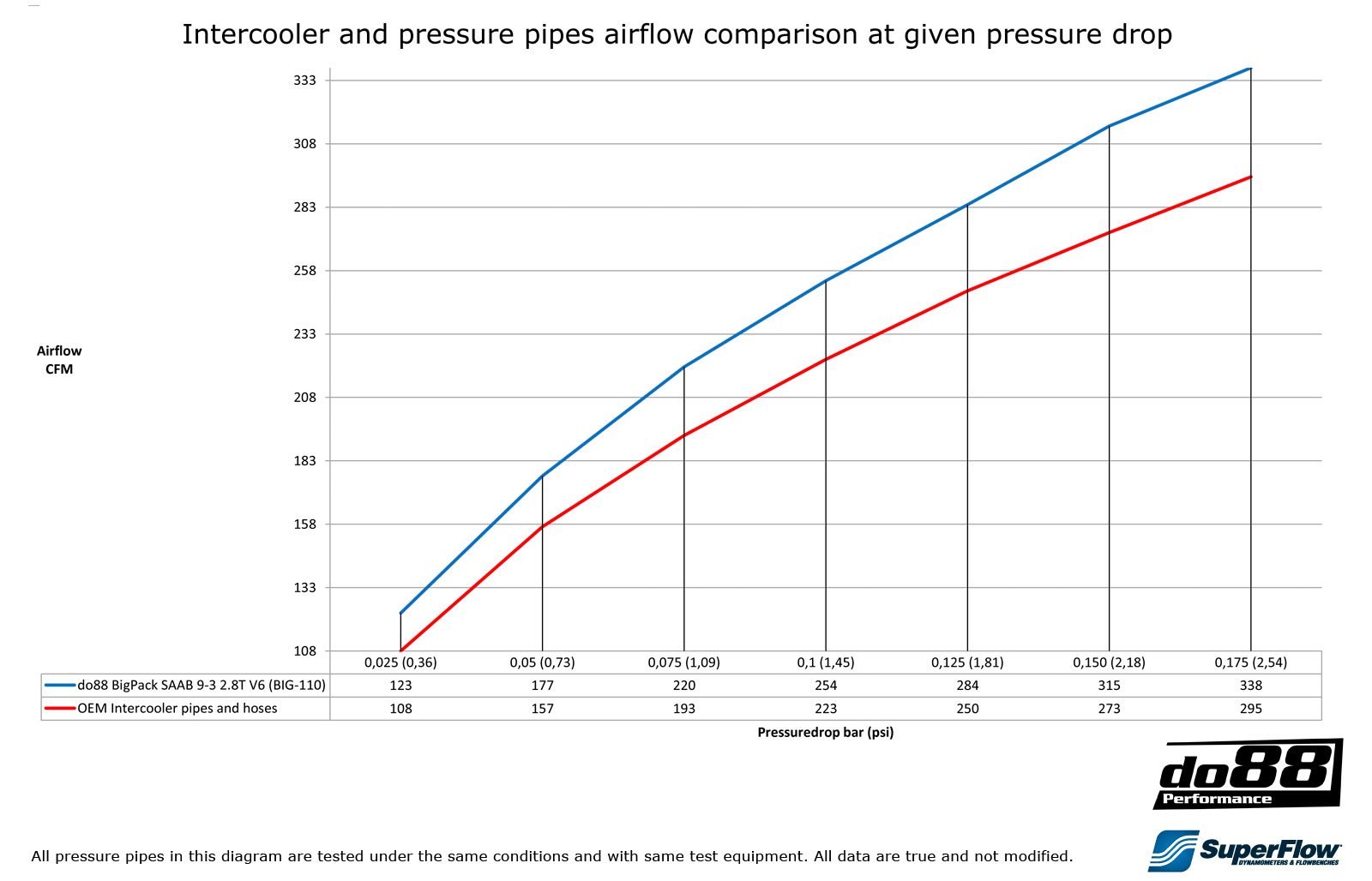 This diagram shows the charge air flow at different pressure drops of do88 BigPack compared to OEM intercooler and pipes*: