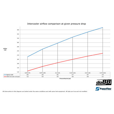 This diagram shows the charge air flow at different pressure drops of do88 BigPack compared to OEM intercooler and pipes*: