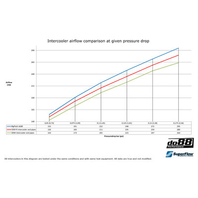 This diagram shows the charge air flow at different pressure drops of do88 BigPack compared to OEM intercooler and pipes*: