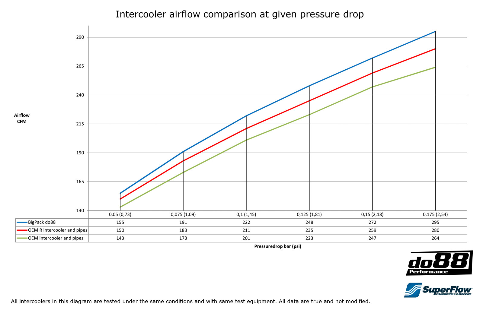 This diagram shows the charge air flow at different pressure drops of do88 BigPack compared to OEM intercooler and pipes*: