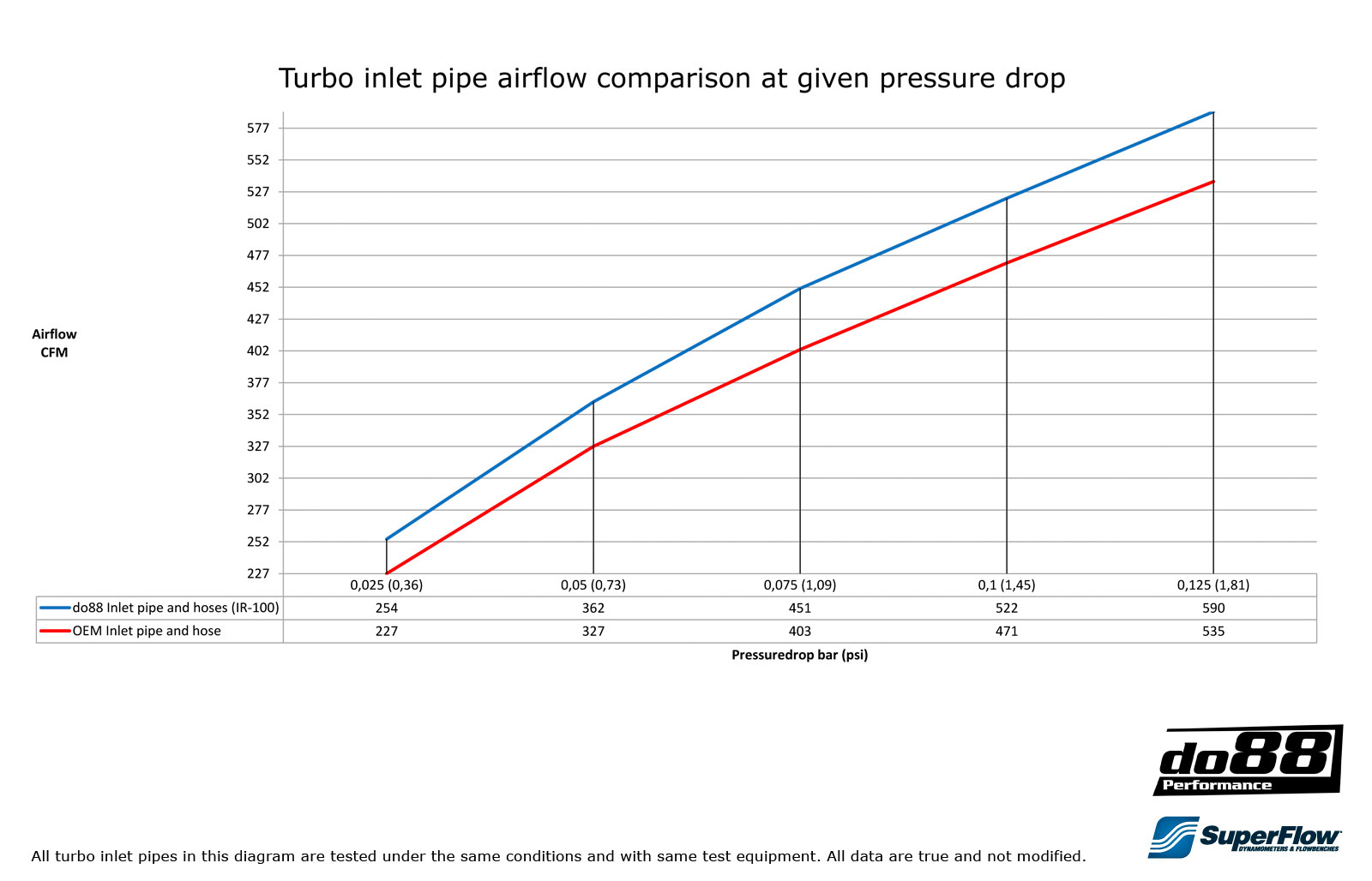do88 turbo inlet pipe has an air flow at 0,125bar/1,81psi pressure drop 590CFM, compared to the OEM pipe that has 535CFM.