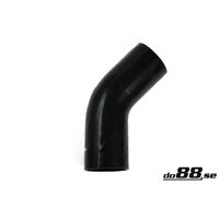 Black silicone hose 45 degree elbow suitable for pressure or suction applications, for example between turbocharger and intercooler or between turbocharger and air filter. Also suitable for coolingsystems.