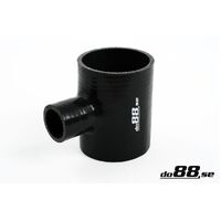 Black silicone T-hose. A 102mm long hose with one extra connection in the middle suitable for pressure or suction applications, for example between turbocharger and intercooler or between turbocharger and air filter. Also suitable for cooling systems.