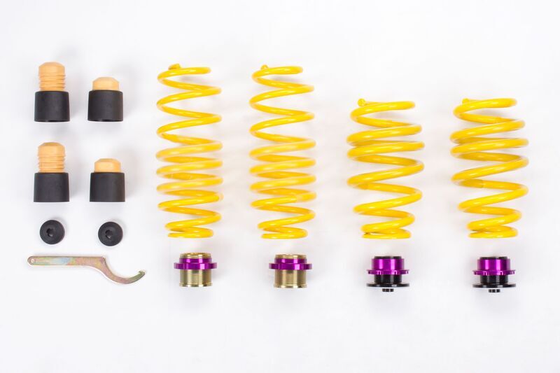 The KW height adjustable spring kit is used for lowering of the vehicle in combination with the standard dampers. Unlike to conventional spring kits, a customized height adjustment is possible within the tested adjustment range. For this solution, vehicle-specific spring seats with adapted KW lowering springs and matching elastomers as well as dust protection systems are used. The standard damper system for example with electronic or hydraulic control, continues to remain active.