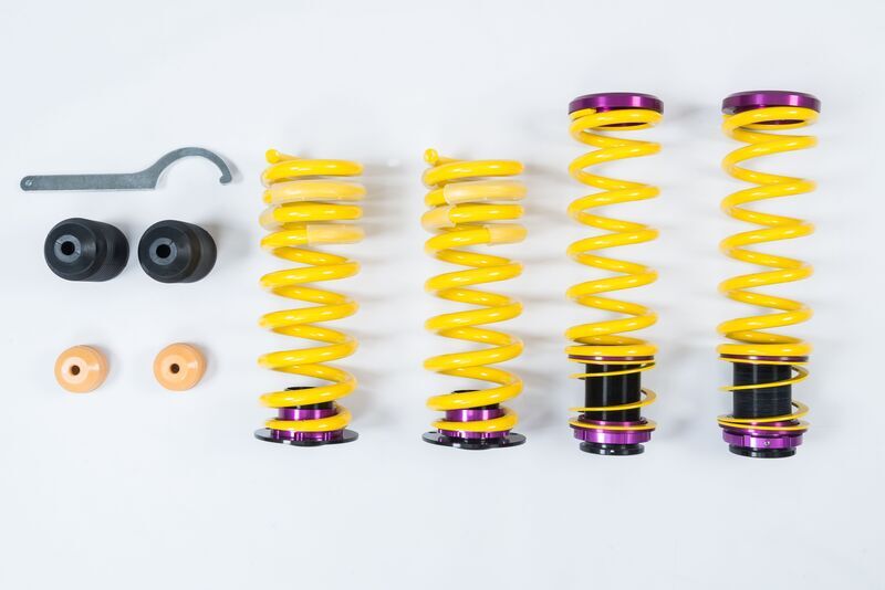 The KW height adjustable spring kit is used for lowering of the vehicle in combination with the standard dampers. Unlike to conventional spring kits, a customized height adjustment is possible within the tested adjustment range. For this solution, vehicle-specific spring seats with adapted KW lowering springs and matching elastomers as well as dust protection systems are used. The standard damper system for example with electronic or hydraulic control, continues to remain active.