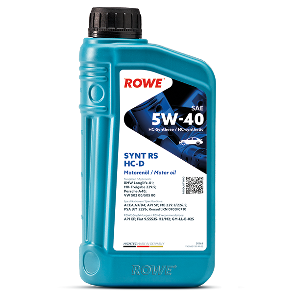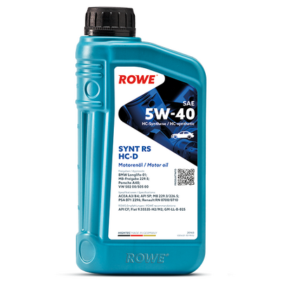 HIGHTEC SYNT RS HC-D SAE 5W-40 is a high-performance engine oil produced using HC synthetic oils with a wide area of application. Its distinguished level of performance is achieved through the interaction of selected base oils and advanced additives. Application HIGHTEC SYNT RS HC-D SAE 5W-40 was developed specifically to meet the requirements of modern passenger car engines with extended maintenance intervals (WIV/LongLife Service). It is particularly suitable for vehicles equipped with Otto and diesel engines, with or without turbocharging, and is used for vehicles without particulate filter systems according to the manufacturer’s specification. Its modern design makes a wide range of applications possible and ensures safe operation under all operating conditions. Approvals BMW Longlife-01 MB-Freigabe 229.5 Porsche A40 VW 502 00/505 00 Specifications ACEA A3/B4 API SP MB 229.3/226.5 PSA B71 2296 Renault RN 0700/0710 ROWE recommendations API CF Fiat 9.55535-H2/M2 GM-LL-B-025